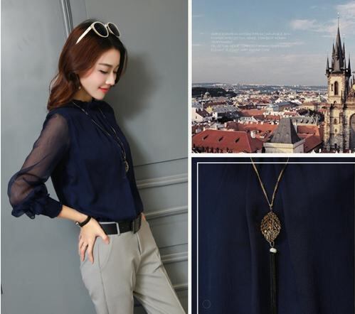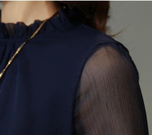 No.8928 Lサイズ ネイビー レディース ブラウス シフォン 長袖 シースルー フォーマル シャツ ハイネック フリル 透け感
