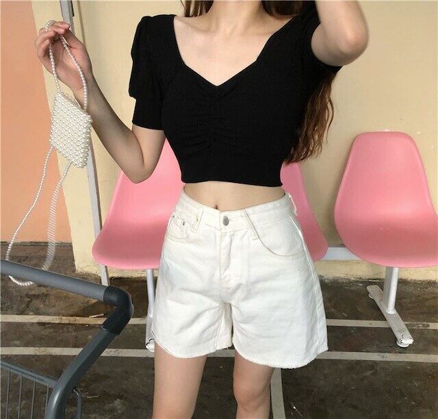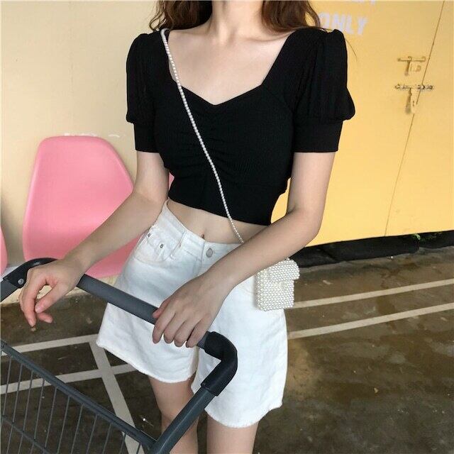 No.2687 黒 ワンサイズ ボトムシャツ 丈短トップス 丈短Tシャツ バススリーブ スクエアネック 半袖 カジュアル お出かけ
