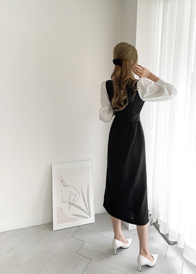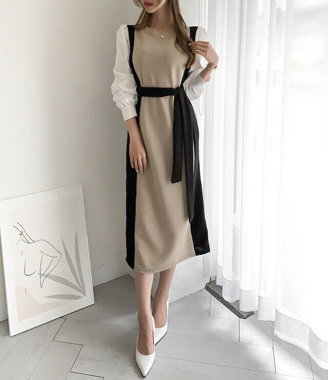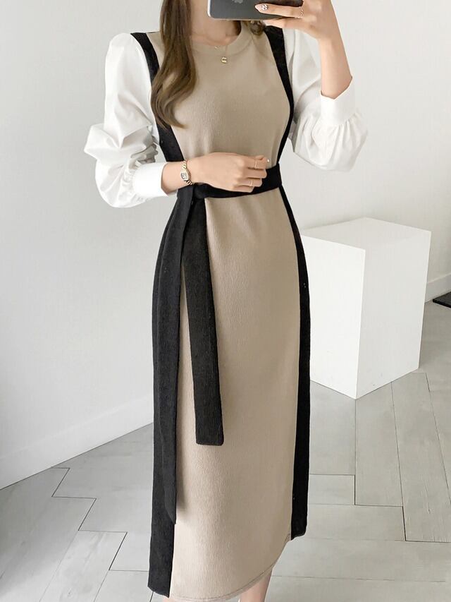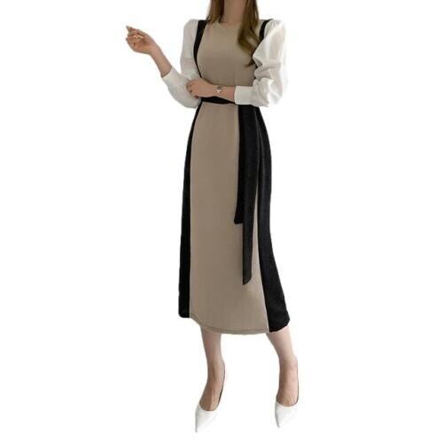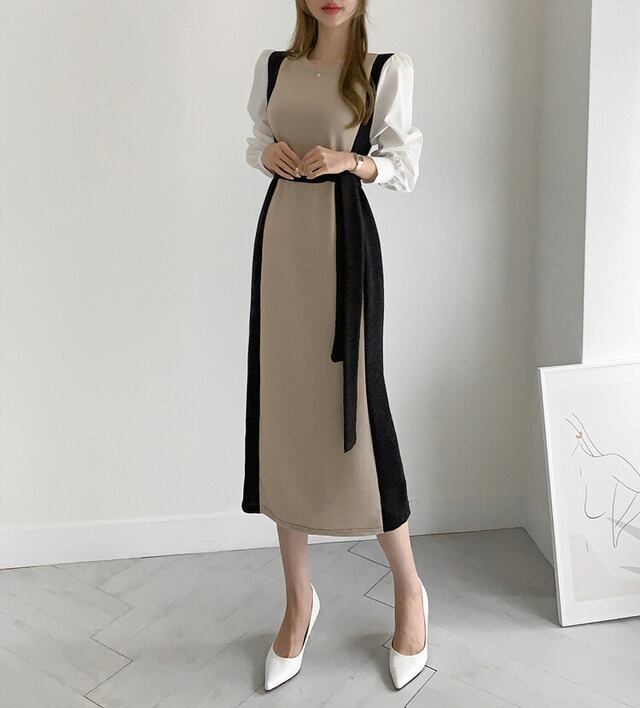 No.2694 韓国シック ラウンドネックカラー マッチング ツーピースパフスリーブ ネクタイウエスト ロングニット