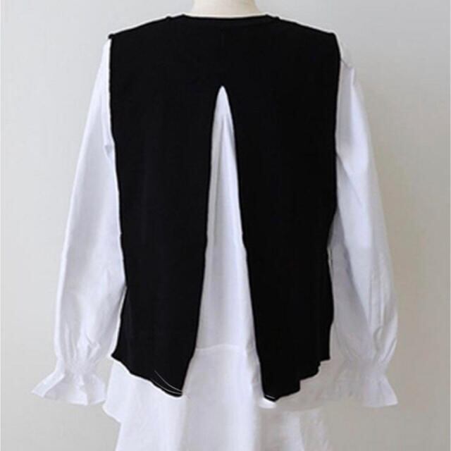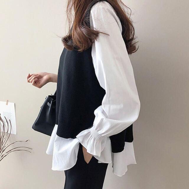 No.11016 Lサイズ ニットニット ベストと ペプラム フレア シャツ ブラウス セット ブラック ホワイト