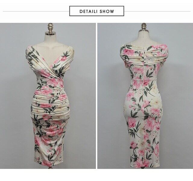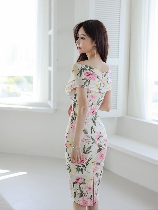No.2646 M レディース スリム ワンピース Vネック ハイウエスト 花柄 タイトスタイル ノースリープ ミドル丈 ドレス ホワイト